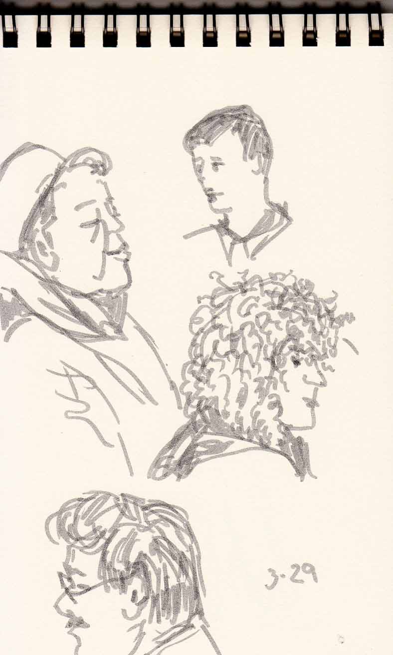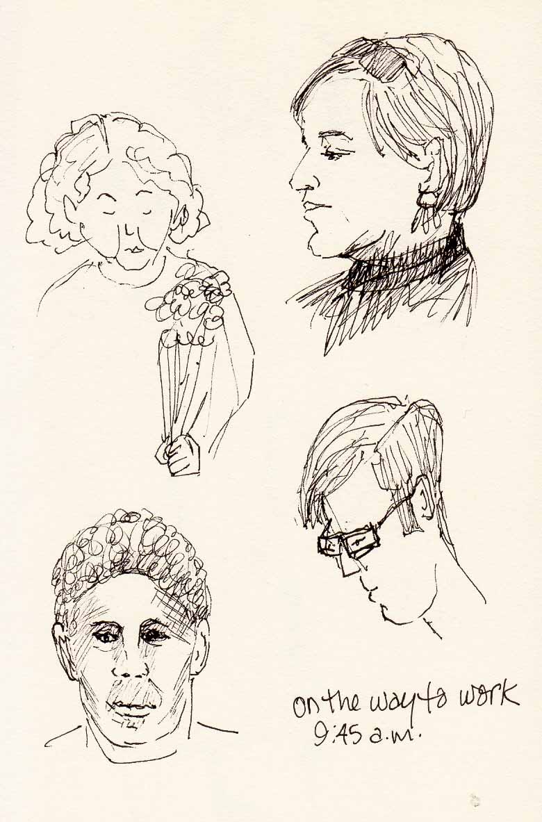 Here are some random people sketches, mostly from my 13 minute subway ride to work. They are displayed first in a slide show (with arrows to click through) and at the bottom in “gallery” format. In gallery format you can click to enlarge a picture.