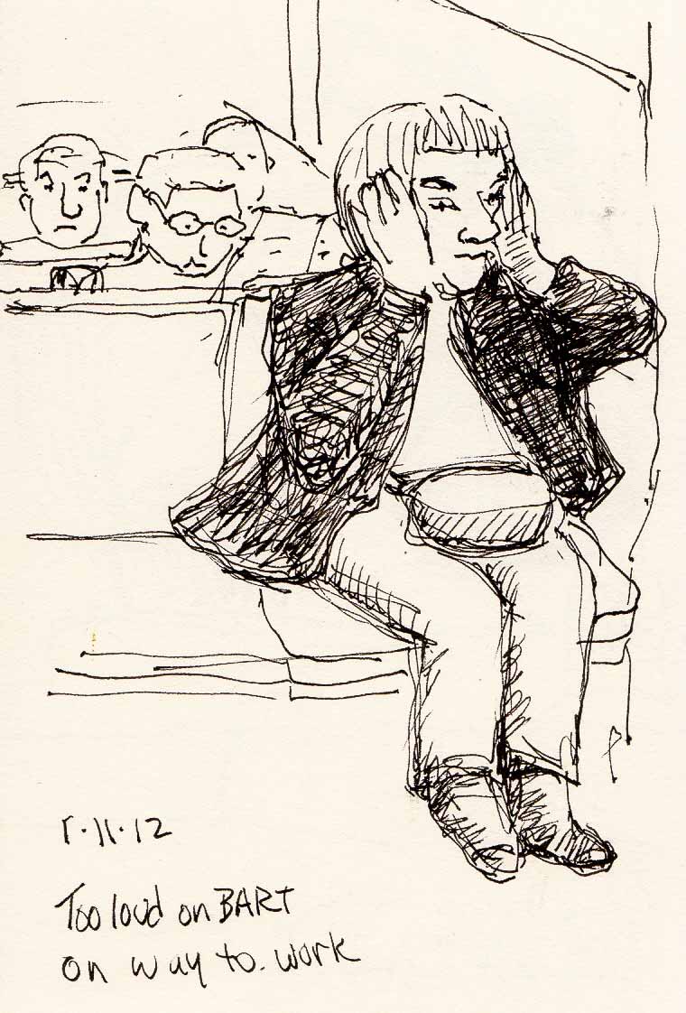 You can imagine my glee when this gentleman in full Mohawk sat down across from me on BART. Entranced by his cell phone, he never noticed me sketching and held perfectly still. It must have taken him a long time to get his hair to stand up so perfectly–and why? Especially first thing in the morning? I awarded him a sticker (on his page) from National Geographic.