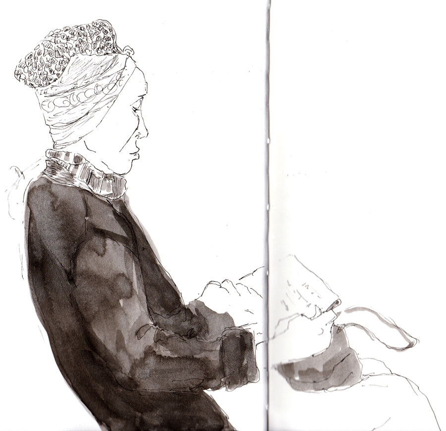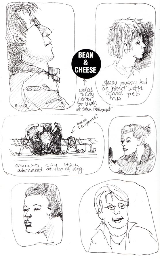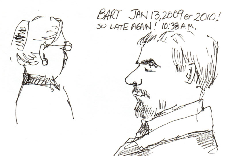 I’m not a fan of crowds, blockbusters or standing in line, but I put up with all the above to visit the Birth of Impressionism show in San Francisco’s De Young Museum in Golden Gate Park. I had planned to sketch in the park after the show but various delays only left time for these done while traveling there and back on BART and SF Muni.