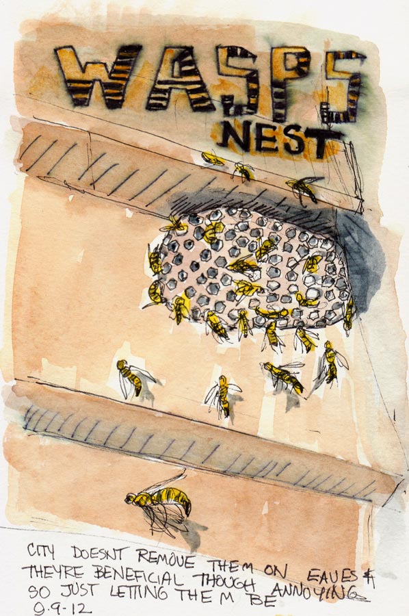 This wasp just wanted nectar from the flower. My friend Barbara just spent big bucks getting rid of hundreds of wasps that built nests in her attic and were invading her house. We don’t know what they wanted. This is the last of the leftover sketches from our endless summer, now being called California’s worst drought in 500 years.